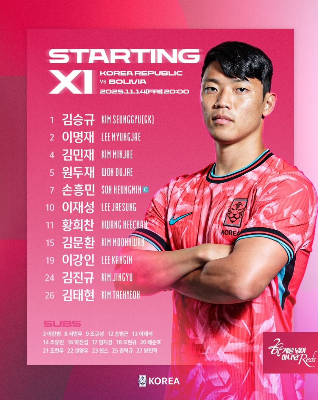한국 남자 축구 대표팀의 14일 볼리비아전 선발 라인업/대한축구협회 |