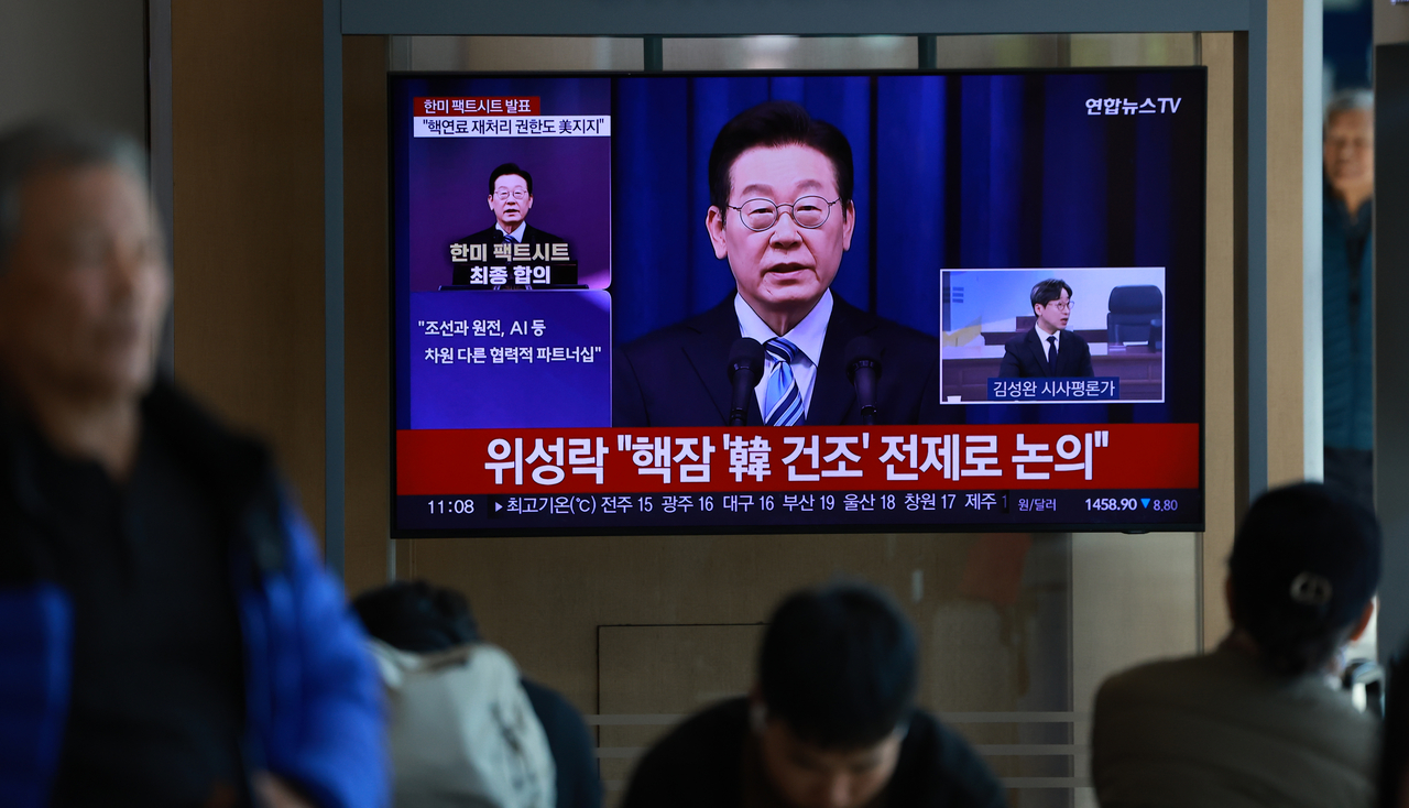 14일 서울역 대합실의 TV 화면에 한미 팩트시트 최종 합의 발표 관련 뉴스가 방송되고 있다. [연합] |