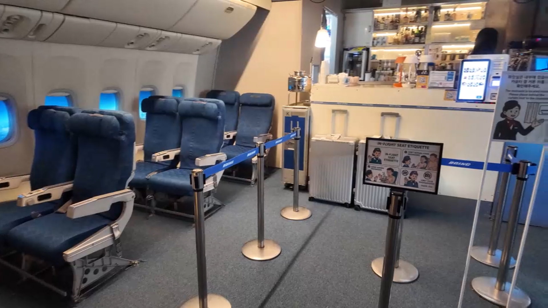 좌석부터 창문까지 실제 비행기처럼 꾸며져 있는데요. 이렇게 서울 도심 한복판에서 해외여행을 떠나는 듯한 기분을 느낄 수 있습니다.