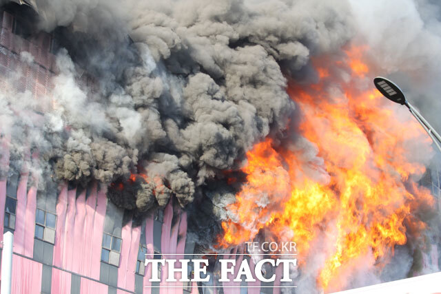 [더팩트ㅣ장병문 기자] 15일 오전 6시에 발생한 이랜드패션 물류센터 화재가 좀처럼 불길이 잡히지 않고 있다. 내부에 적재된 옷과 신발들이 소방대원들의 진입을 막고 있어서다.