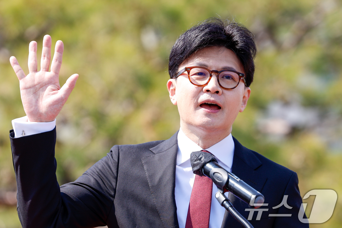 한동훈 국민의힘 전 대표가 10일 오후 서울 여의도 국회 분수대 앞에서 제21대 대통령 선거 출마를 선언하고 있다. 2025.4.10/뉴스1 ⓒ News1 안은나 기자 |