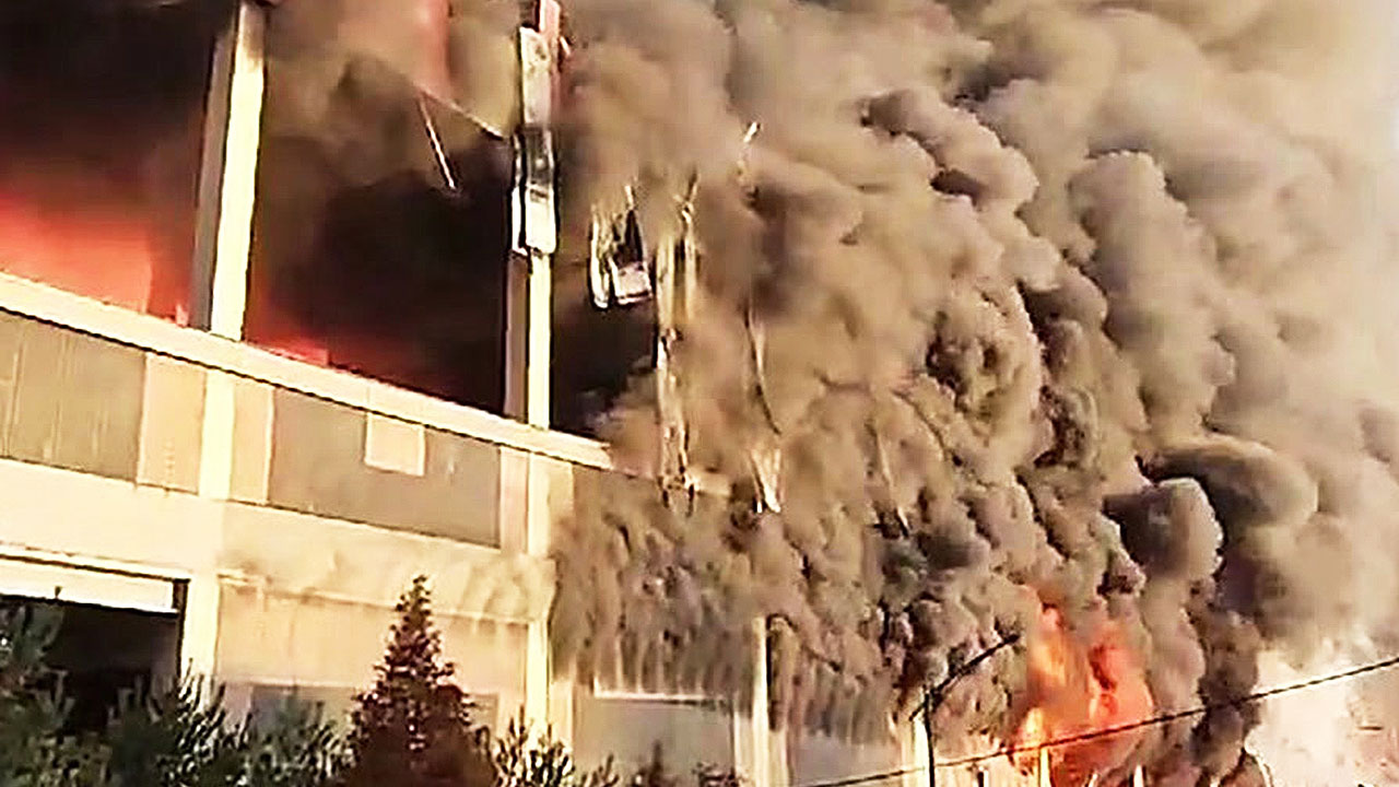 건물이 시뻘건 불길에 휩싸였고, 검은 연기 기둥이 하늘로 솟구칩니다.