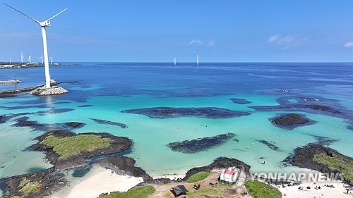 구좌읍 행원리 코난해변은 쪽빛 바다와 풍차가 어우러진 풍광이 근사하다. 여름엔 스노클링 명소로 꼽힌다.