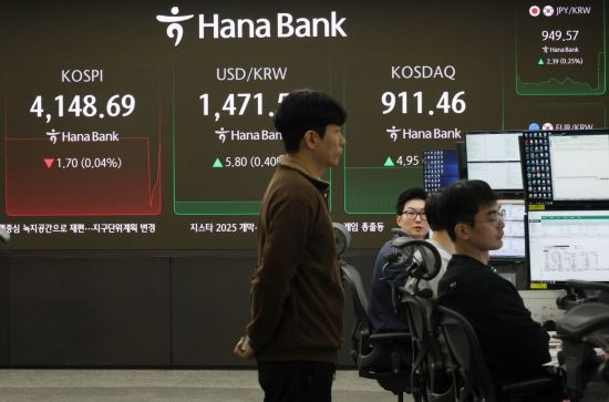 13일 서울 중구 하나은행 딜링룸 현황판에 코스피, 원/달러 환율, 코스닥지수 등이 표시돼 있다. 이날 코스피는 전장 보다 0.55% 내린 4127.57에, 원/달러 환율, 3.3원 오른 1469.0원에 장을 시작했다. |