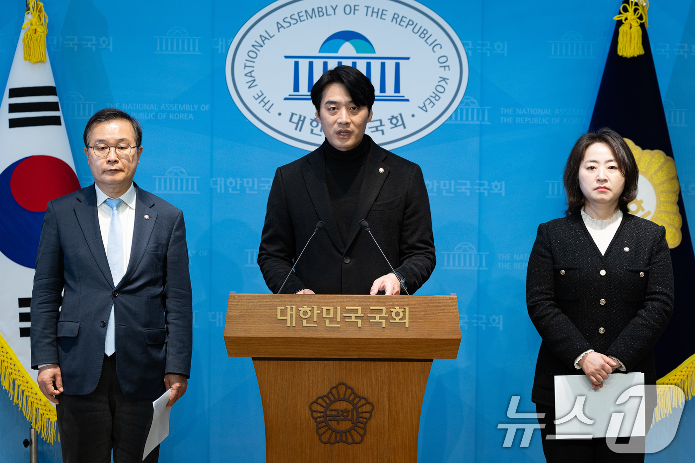 (서울=뉴스1) 유승관 기자 = 한준호 더불어민주당 정치검찰 조작기소대응특별위원회 위원장을 비롯한 소속 의원들이 16일 서울 여의도 국회 소통관에서 대장동 사건 정영학 녹취록 조작 정치검찰 규탄 기자회견을 하고 있다. 왼쪽부터 이건태 의원, 한 위원장, 이주희 의원. 2025.11.16/뉴스1