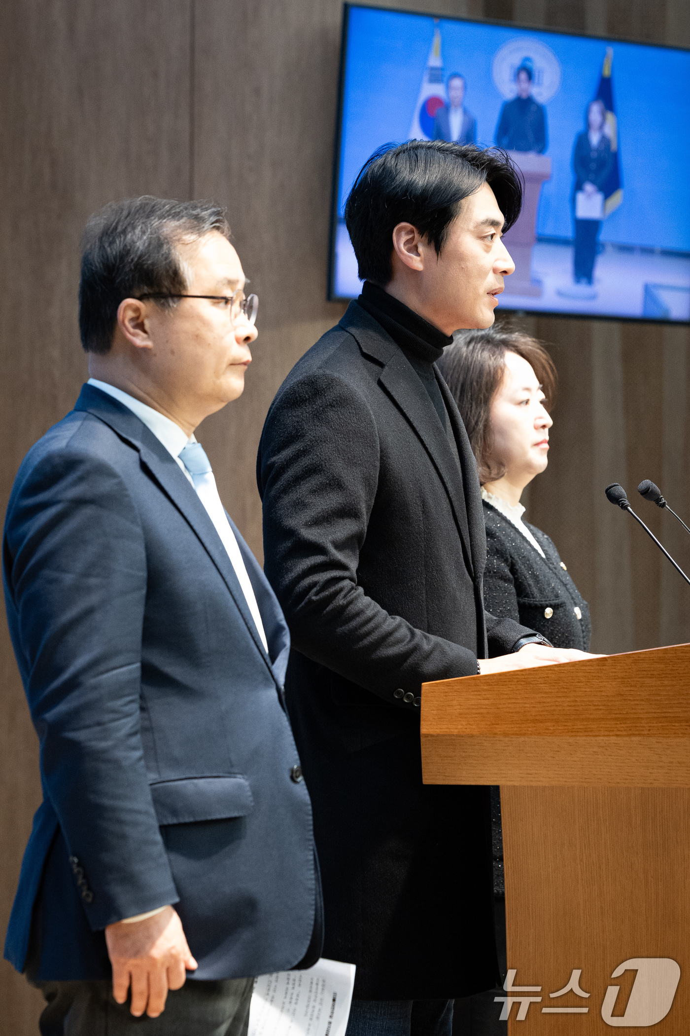 (서울=뉴스1) 유승관 기자 = 한준호 더불어민주당 정치검찰 조작기소대응특별위원회 위원장을 비롯한 소속 의원들이 16일 서울 여의도 국회 소통관에서 대장동 사건 정영학 녹취록 조작 정치검찰 규탄 기자회견을 하고 있다. 왼쪽부터 이건태 의원, 한 위원장, 이주희 의원. 2025.11.16/뉴스1