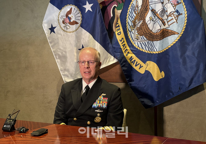 방한한 대럴 커들 미국 해군참모총장이 지난 14일 서울 그랜드하얏트 호텔에서 국방부 기자단 및 외신 기자들과 인터뷰를 하고 있다. (국방부공동취재단) |