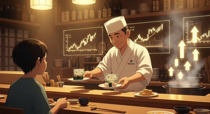 셰프가 여러 초밥을 하나로 묶어 만든 세트처럼 여러 주식을 묶어 상품화한 펀드와 ETF를 비유한 그림. [Whisk] |
