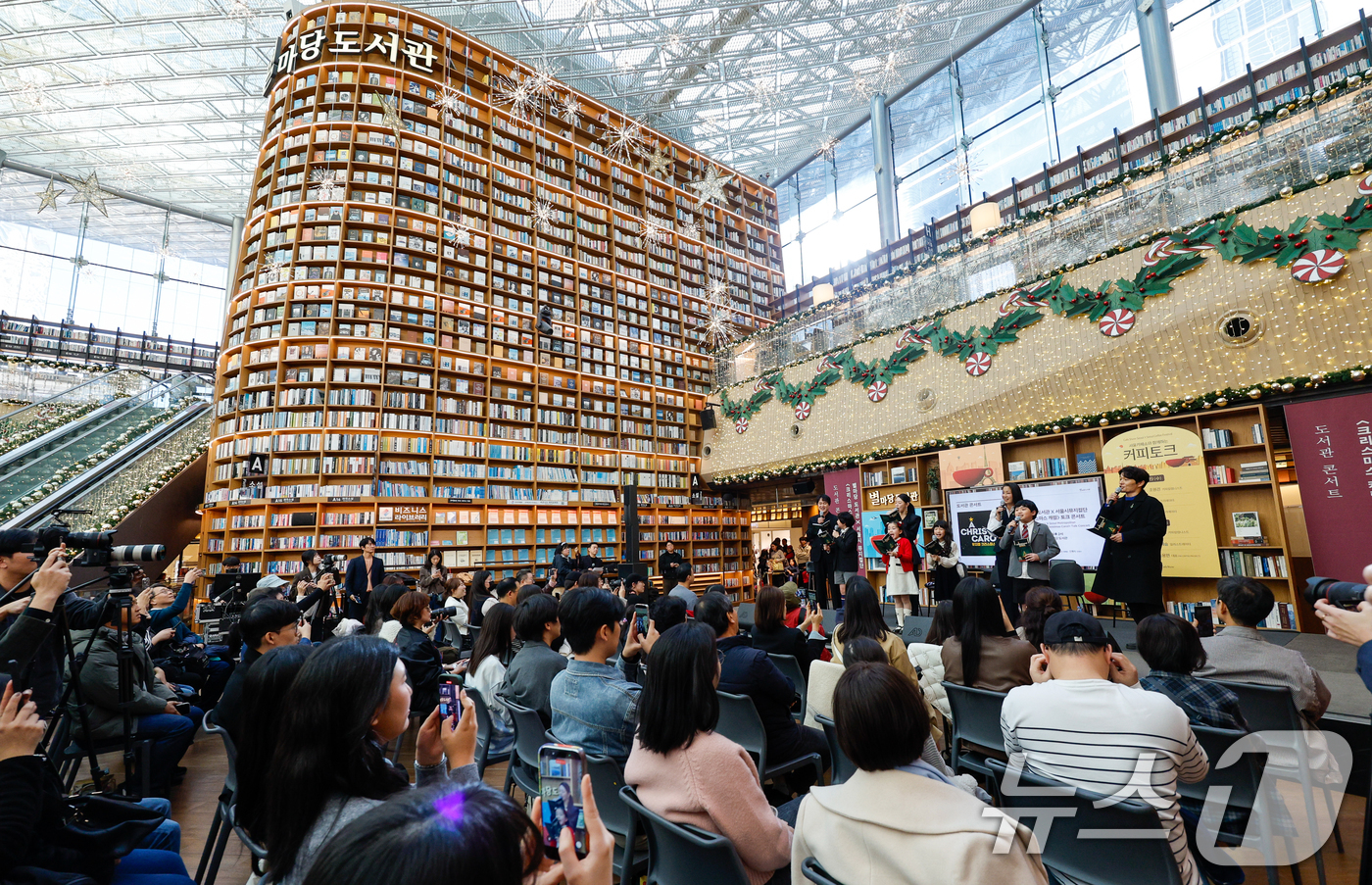 (서울=뉴스1) 안은나 기자 = 뮤지컬 배우 리사(Lisa), 이연경, 이경준, 한일경, 아역배우 윤도영, 최지훈, 우도연, 최예린이 16일 오후 서울 강남구 코엑스 별마당 도서관에서 열린 서울시뮤지컬단 '크리스마스 캐럴' 토크 콘서트에서 주요 넘버를 선보이고 있다. 영국의 대문호 찰스 디킨스가 집필한 구두쇠 '스크루지'의 이야기를 다룬 가족 뮤지컬 '크리스마스 캐럴'은 내달 5일부터 세종문화회관 M씨어터에서 초연한다. 2025.11.16/뉴스1