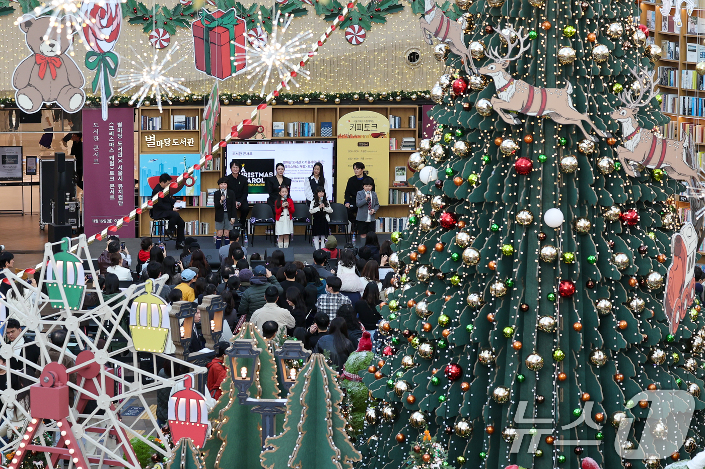 (서울=뉴스1) 안은나 기자 = 뮤지컬 배우 리사(Lisa), 이연경, 이경준, 한일경, 아역배우 윤도영, 최지훈, 우도연, 최예린이 16일 오후 서울 강남구 코엑스 별마당 도서관에서 열린 서울시뮤지컬단 '크리스마스 캐럴' 토크 콘서트에서 주요 넘버를 선보이고 있다. 영국의 대문호 찰스 디킨스가 집필한 구두쇠 '스크루지'의 이야기를 다룬 가족 뮤지컬 '크리스마스 캐럴'은 내달 5일부터 세종문화회관 M씨어터에서 초연한다. 2025.11.16/뉴스1
