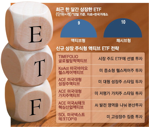 12일 금융투자업계에 따르면 지난 한 달간 한국거래소에 상장된 ETF 19개 중 9개가 액티브 ETF다. 신상품 출시 중 절반가량이 액티브 상품이었던 셈이다. 기존 ETF 시장에서 전체 상품의 약 26%만이 액티브 상품이었던 것을 감안하면 최근 들어 액티브 ETF 상품 출시 빈도가 높아졌음을 알 수 있다.