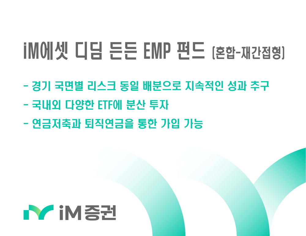 'iM에셋 디딤 든든 EMP 펀드'는 건전한 자산 배분과 연금 투자 문화의 확산을 위해 도입된 디딤펀드로 연금저축과 퇴직연금 등을 통해 가입이 가능하다. 국내외 다양한 상장지수펀드(ETF) 투자로 어떠한 경기 국면에서도 지속적이고 장기적인 수익 창출을 추구한다.