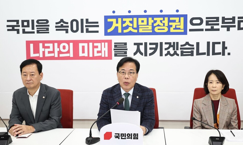 송언석 국민의힘 원내대표가 16일 국회에서 현안관련 기자간담회를 하고 있다. 윤운식 선임기자 yws@hani.co.kr |