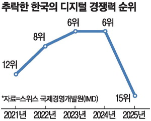 16일 스위스 국제경영개발원(IMD)이 발표한 '2025 세계 디지털 경쟁력 순위'에 따르면 한국은 전년도 6위에서 9계단 하락한 15위를 기록했다.