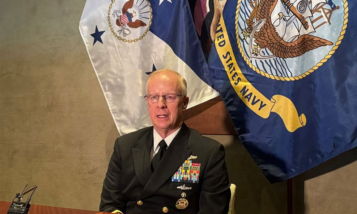 대럴 커들 미 해군참모총장이 14일 국방부 기자단과 인터뷰를 진행하고 있는 모습. 미국 해군 제공 |