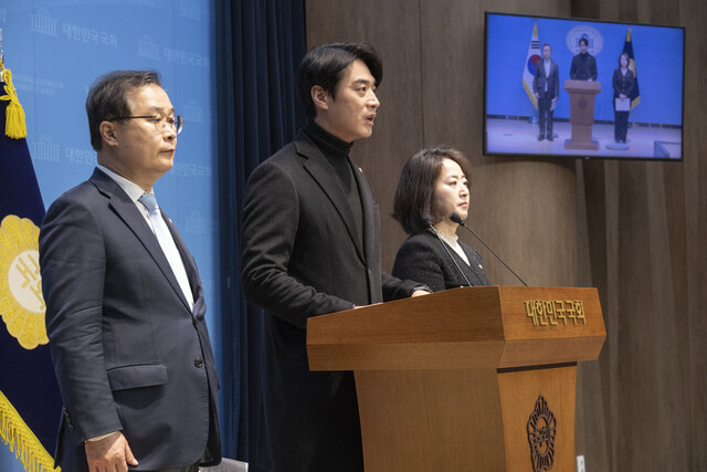 더불어민주당 정치검찰 조작 기소 대응 특별위원회 소속 의원들이 16일 국회에서 대장동 사건 정영학씨 조사에서 녹취록을 조작한 검찰을 규탄하는 기자회견을 하고 있다. 왼쪽부터 이건태, 한준호, 이주희 민주당 의원. 연합뉴스 |