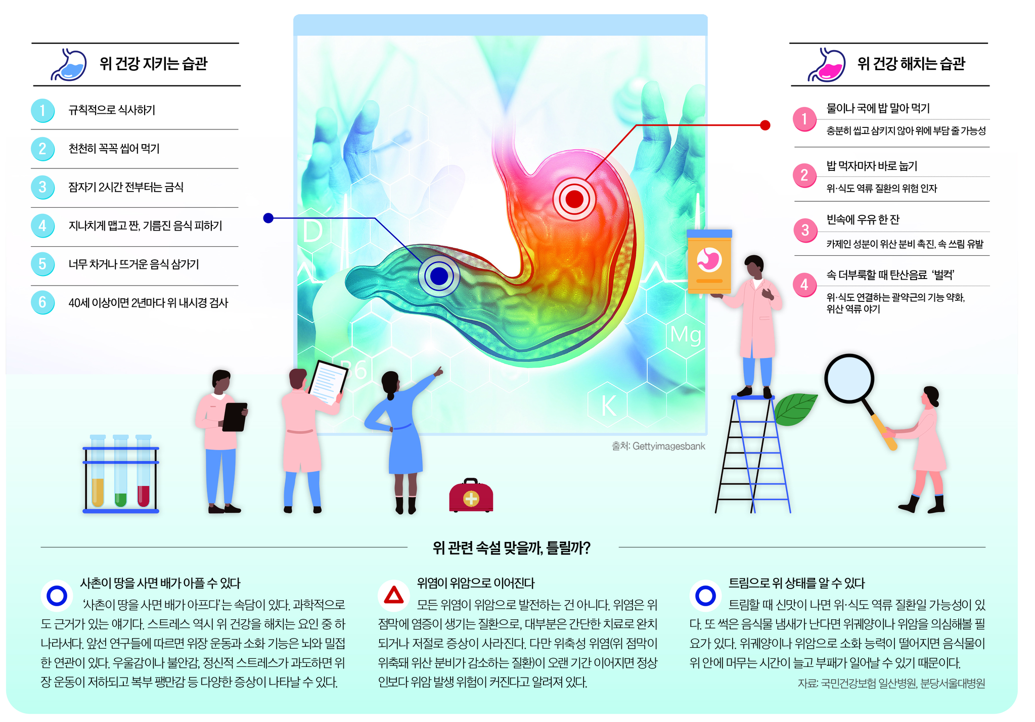 조기 대응을 위해 알코올성 위염의 의심 신호도 기억해 두면 좋다. 알코올성 위염은 알코올에 의해 위 점막이 손상된 상태다. 대부분 증상이 없으나 명치 부위 또는 상복부 통증, 오심, 구토 등이 나타날 수 있다. 이럴 때는 증상을 악화하는 흡연, 음주, 카페인, 자극적인 음식 등은 피하고 위산 억제제, 위 점막 보호제 같은 약물로 치료를 진행하는 게 바람직하다.