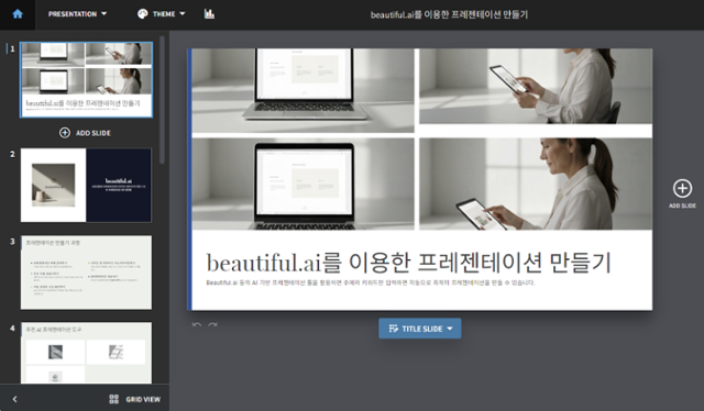 오픈AI가 챗GPT를 발표한 지 벌써 3년이 됐다. 생성형AI는 익숙했던 일상과 산업 현장을 지금까지 겪어보지 못한 새로운 모습으로 빠르게 바꿔가는 중이다. 한국일보는 우리 곁에서 일어나고 있는 그 놀라운 변화들을 공유하고, 차세대 AI 기술이 보여줄 미래 모습을 전망해보는 기획시리즈를 준비했다.뷰티풀.ai에 '뷰티풀.ai를 이용해 프레젠테이션 만들기'에 대한 프레젠테이션을 만들어 달라고 요청하자 AI로 생성된 발표 자료가 화면에 나타났다. 뷰티풀.ai 캡처 |