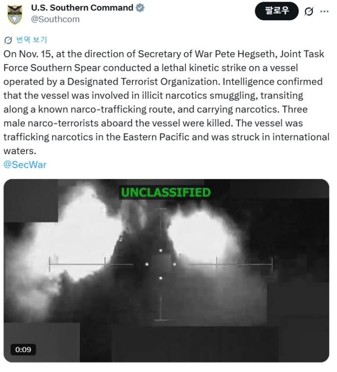 미군 남부사령부는 16일(현지시간) SNS 엑스(X)에 올린 글에서 "피트 헤그세스 전쟁부 장관의 지시에 따라, 합동 태스크포스(TF) '서던 스피어'(Southern Spear)는 11월 15일 지정 테러조직(DTO)이 운용하던 선박에 대해 치명적인 물리적 공격을 수행했다"고 밝혔다.