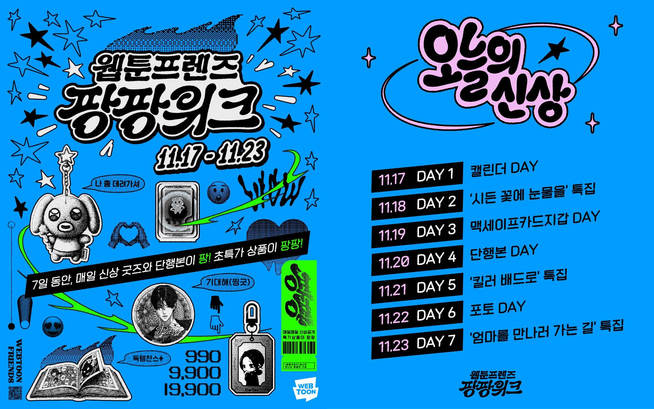 네이버웹툰은 자사 공식 굿즈몰 ‘웹툰프렌즈(Webtoon Friends) 브랜드스토어’에서 17일부터 23일까지 일주일간 신상품 공개 및 할인 행사 ‘웹툰프렌즈 팡팡위크’를 진행한다고 밝혔다.