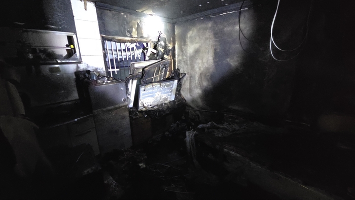 지난 16일 오후 11시 35분께 경남 창원시 마산회원구 합성동 한 5층짜리 모텔 1층 객실에서 불이 나 장기투숙중인 50대가 전신화상을 입었다. <창원소방본부> |