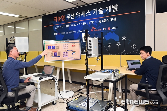 한국전자통신연구원(ETRI)이 17일 6G 시대의 핵심 기반 기술인 지능형 무선 액세스기술(AI-RAN) 개발을 완료했다고 밝혔다. 인공지능(AI)이 통신망을 스스로 제어, 최적화할 수 있는 'AI-Native'는 5G보다 최대 10배 높은 전송 효율을 달성할 것으로 기대된다. ETRI 연구진이 지능형 무선 액세스 기술을 시연하고 있다.