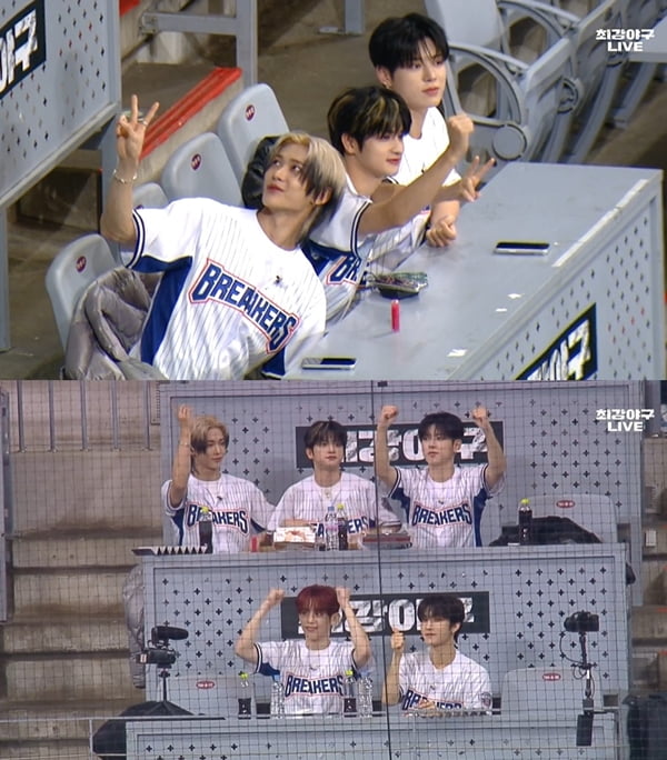 나우즈(NOWZ)는 지난 16일 서울 고척 스카이돔에서 열린 JTBC '최강야구' 두 번째 직관(직접 관람) 경기에 참석했다. 멤버들은 이날 브레이커스와 서울 야구 명문고 연합팀 경기의 시구자로 나선 같은 소속사 선배 가수인 i-dle (아이들) 미연을 응원했다.