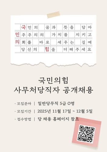 (서울=연합뉴스) 조다운 기자 = 국민의힘은 17일 2025년 신입 사무처 당직자 공개채용을 실시한다고 밝혔다.