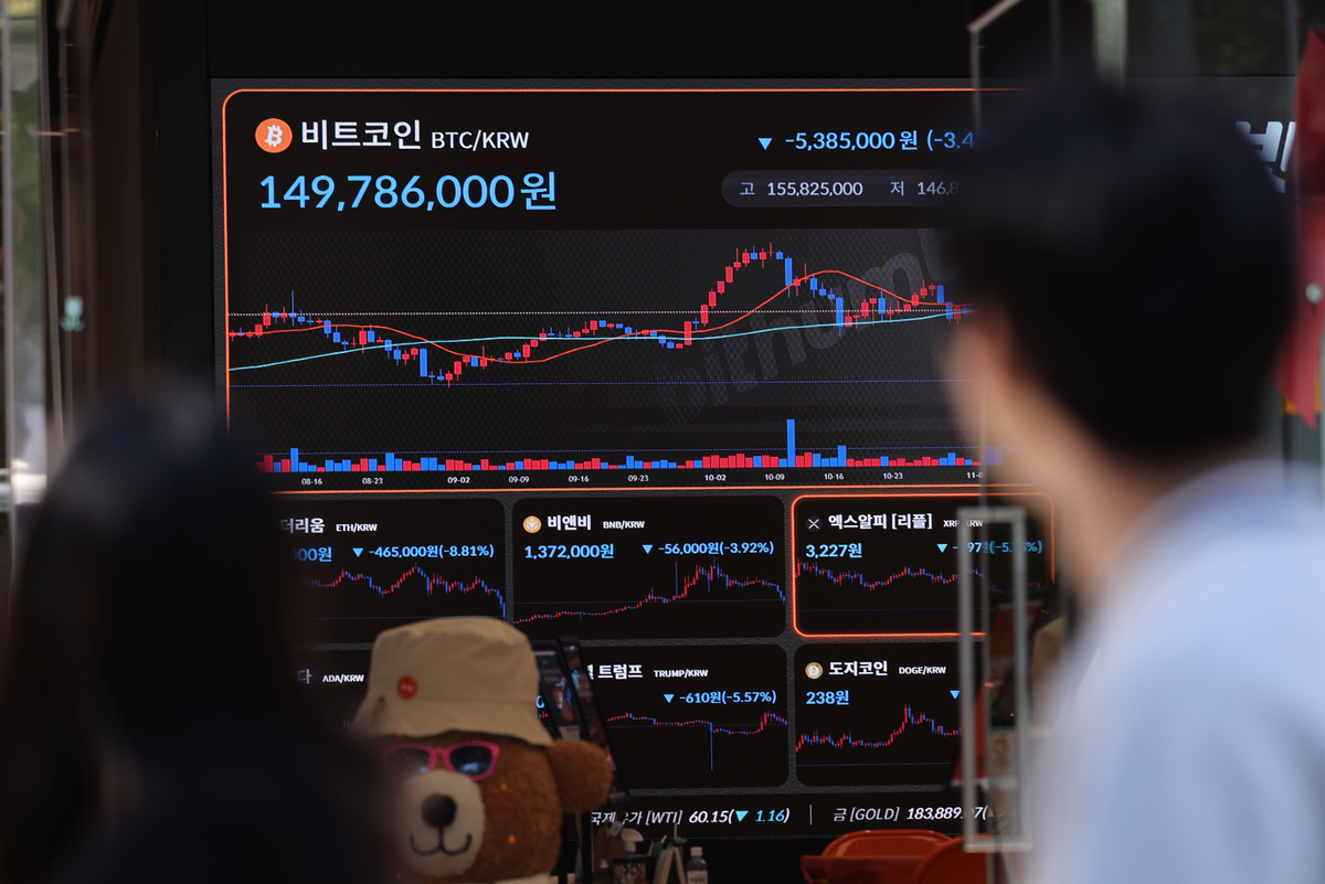 한국시간 17일 오후 12시30분 기준 가상자산 시가총액 1위인 비트코인이 개당 9만5300달러(약 1억3920만원)에 거래되며, 약 한 달 만에 올해 상승분을 모두 반납했다. 사진은 지난 5일 서울 강남구 빗썸 라운지 전광판 표시된 비트코인 시세. 연합뉴스 |