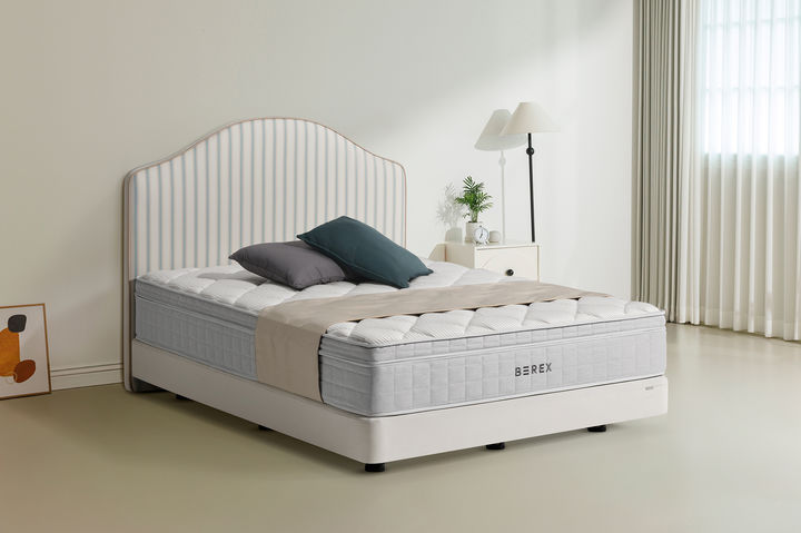 비렉스 루나 프레임은 곡선미를 살린 헤드보드가 클래식한 감성을 자아낸다. 헤드보드 테두리는 원단을 둥글게 말아 처리한 파이핑 장식으로 고급스러움을 높였다. 헤드보드 두께는 약 90㎜로 슬림해 공간 활용 또한 뛰어나다.