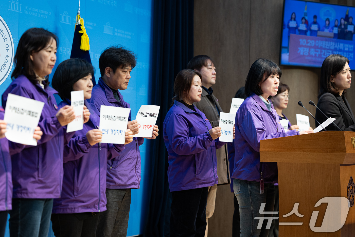 (서울=뉴스1) 유승관 기자 = 10.29 이태원참사 유가족들이 17일 서울 여의도 국회 소통관에서 10.29 이태원참사특별법 개정 촉구 긴급 기자회견을 하고 있다. 2025.11.17/뉴스1