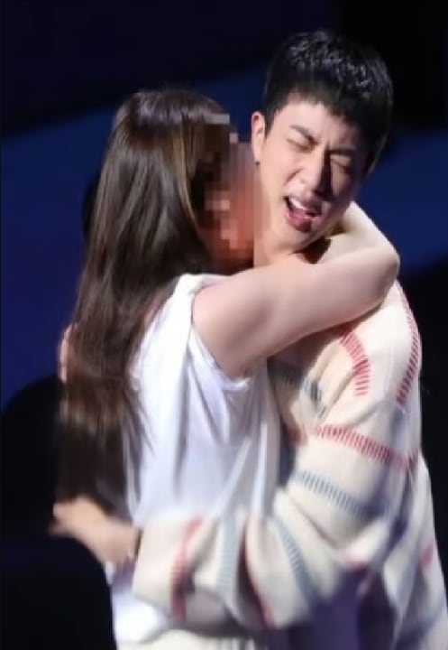 지난해 6월 13일 서울 송파구 잠실실내체육관에서 진행된 포옹(프리허그) 행사에서 일본인 여성 A씨가 진의 볼에 강제로 입을 맞추고 있다. /엑스(X) 캡처 |