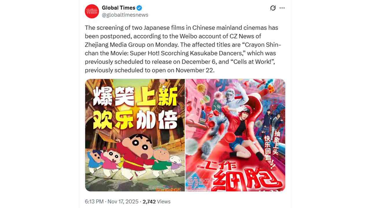 중국 관영 환구시보의 영자지인 글로벌타임스는 현지 시간 17일 중국에서 개봉할 예정이던 '짱구는 못 말려: 초화려! 작열하는 떡잎마을 댄서즈'와 '일하는 세포' 등 일부 일본 영화가 개봉을 연기하기로 했다고 전했습니다.
