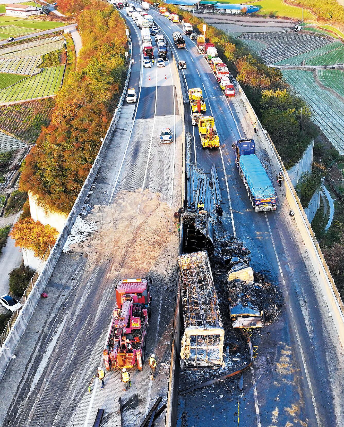 17일 오전 경북 영천시 상주영천고속도로에서 기름을 싣고 상주 방향으로 달리던 26톤 탱크로리 차량이 화물차, 승용차 등과 부딪히면서 총 차량 13대가 연쇄 충돌했다. 이 사고로 화물차 운전자 등 2명이 숨지고 4명이 다쳤다.