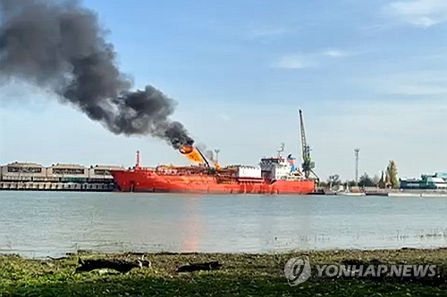 (플라우루 AP=연합뉴스) 17일(현지시간) 우크라이나 이즈마일항의 선박이 러시아 공습에 당해 화재가 발생했다. 2025.11.18 photo@yna.co.kr |