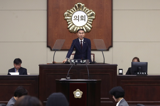 지난 17일 서초구의회 제345회 제2차 정례회 제1차 본회의에서 고선재 의장이 개회사를 하고 있다. 서초구의회 제공 |