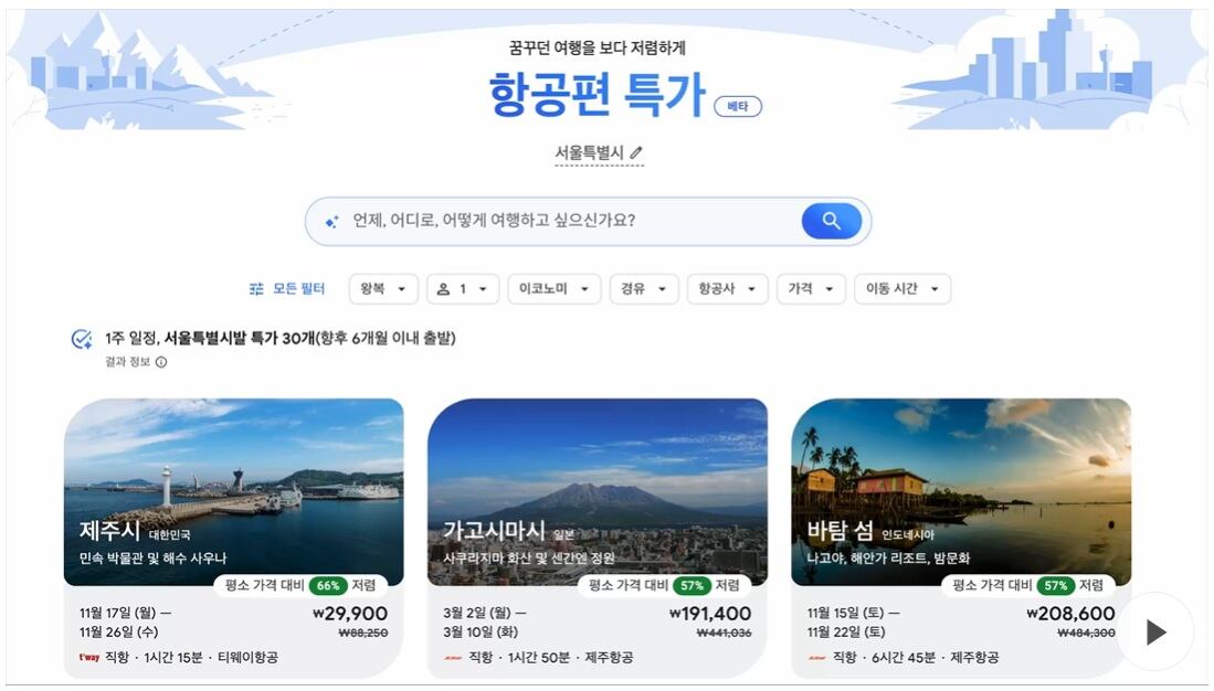 플라이트 딜은 “이번 겨울에 일주일 동안 맛집 많은 도시로 직항만 찾아줘”처럼 자연어로 원하는 여행 조건을 입력하면 구글 AI가 여행 시기, 예산, 선호 목적지, 여행 방식 등 이용자의 검색 조건과 뉘앙스를 파악해 일치하는 목적지를 선별한다. 수백 개 항공사와 예약 사이트의 실시간 데이터를 분석한 뒤 다양한 일정 조합과 가격대를 비교해 가장 합리적인 특가 항공권을 찾아 추천해주는 기능이다.