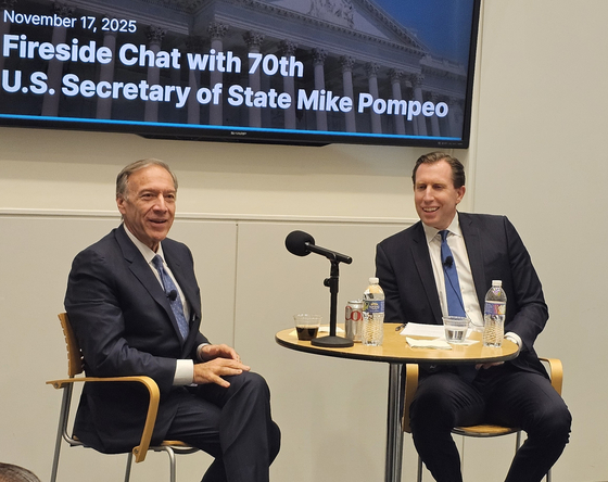 마이크 폼페이오 전 미국 국무장관(왼쪽)이 17일(현지시간) 미국 워싱턴 DC 인근 발로파크 콘퍼런스룸에서 법무법인 대륙아주가 주최한 공개 대담에서 발언하고 있다. 워싱턴=김형구 특파원 |