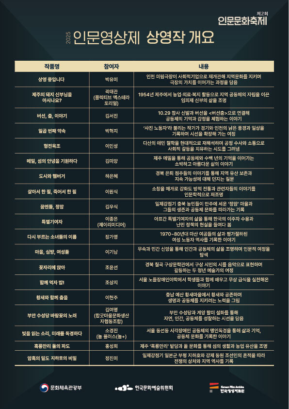 문화체육관광부와 한국문화예술위원회는 11월 20일부터 11월 21일까지 한국영상자료원 시네마테크에서 ‘2025년 인문영상제’를 개최한다.