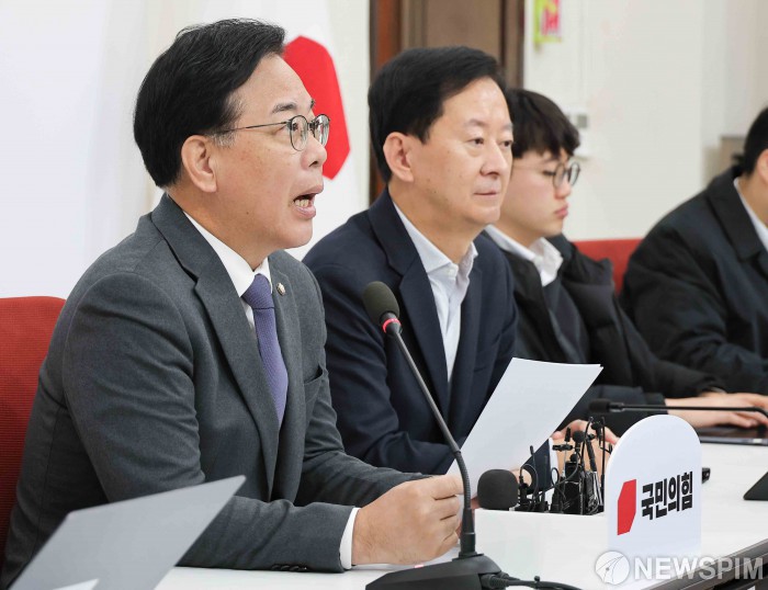 [서울=뉴스핌] 윤창빈 기자 = 송언석 국민의힘 원내대표가 18일 오전 서울 여의도 국회에서 현안 관련 기자간담회를 하고 있다. 2025.11.18 pangbin@newspim.com