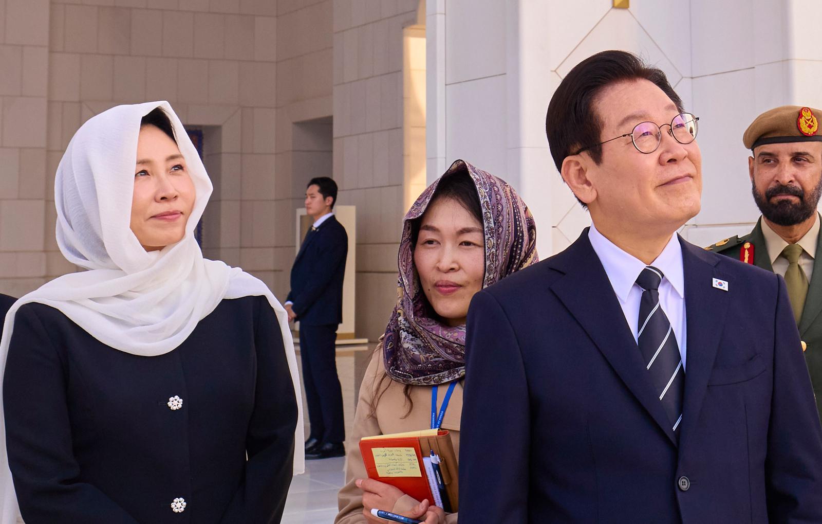 이재명 대통령이 17일(이하 현지시간) 아랍에미리트(UAE) 국빈 방문 첫 일정으로 UAE 현충원과 UAE 초대 대통령의 묘소를 방문했다. 이 자리에는 김혜경 여사도 동행했다.