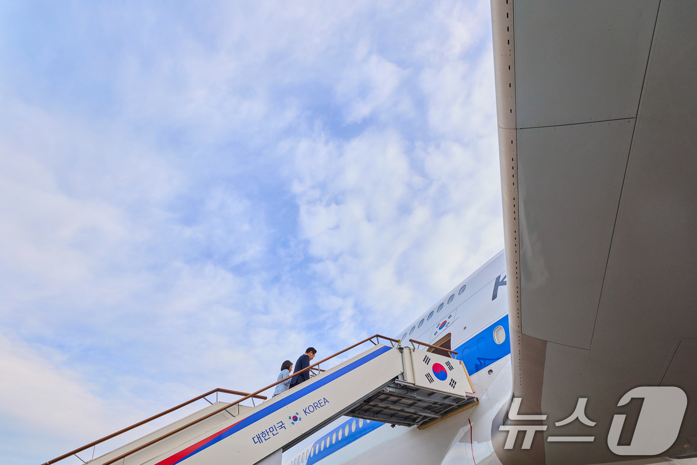 (서울=뉴스1) 허경 기자 = 이재명 대통령과 김혜경 여사가 지난 17일 주요 20개국(G20) 정상회의 참석을 계기로 아프리카와 중동 등 4개국 순방을 위해 경기 성남 서울공항에서 공군1호기에 탑승하고 있다. (대통령실 제공. 재판매 및 DB 금지) 2025.11.18/뉴스1