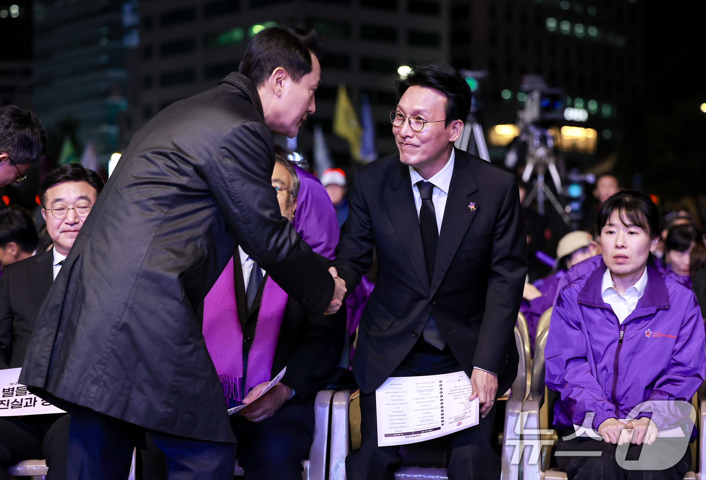 김민석 국무총리가 25일 서울 중구 서울광장에서 열린 10·29 이태원참사 3주기 시민추모대회에서 오세훈 서울시장과 인사를 나누고 있다. (공동취재) 2025.10.25/뉴스1 ⓒ News1 이호윤 기자 |