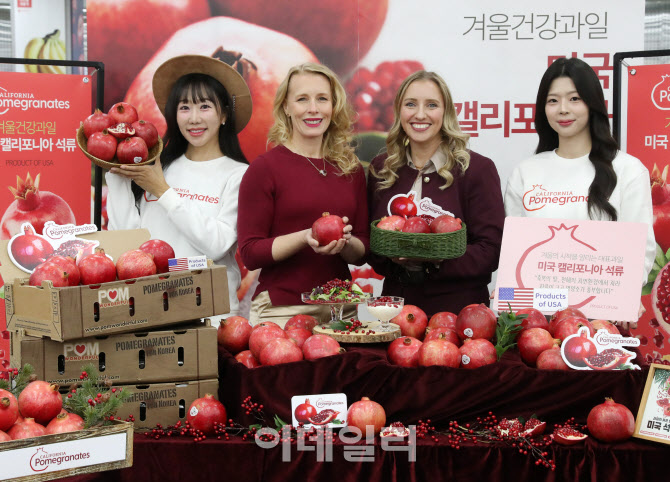 [이데일리 김태형 기자] 18일 롯데마트 제타플렉스 서울역점에서 열린 미국 캘리포니아 석류 출시행사에서 미대사관 농무참사관 켈리 스탱과 농업무역관장 리사 앨런이 모델들과 석류를 홍보하고 있다.