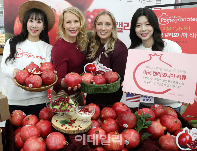 [이데일리 김태형 기자] 18일 롯데마트 제타플렉스 서울역점에서 열린 미국 캘리포니아 석류 출시행사에서 미대사관 농무참사관 켈리 스탱과 농업무역관장 리사 앨런이 모델들과 석류를 홍보하고 있다.