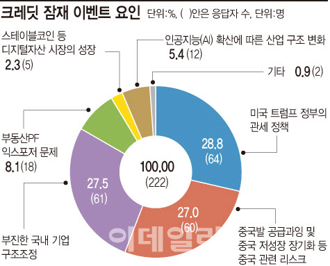 36회 이데일리 신용평가 전문가 설문(SRE: Survey of Credit Rating by Edaily)에서 총 222명의 응답자 중 64명(28.8%)이 향후 국내 크레딧 잠재 이벤트 요인으로 ‘미국 도널드 트럼프 정부의 관세 정책’을 꼽았다. 이어 61명(27.5%)은 ‘부진한 국내 기업 구조조정’을 택했다. 34회 5 위, 35회 3위였던 ‘중국발 공급과잉 및 중국 저성장 장기화 등 중국 관련 리스크’는 60명(27.0%)이 고르면서 3위를 기록했다. 33회부터 35회까지 3년 연속 1위에 올랐던 ‘부동산 PF 익스포저 문제’는 4위로 내려갔다. 이 밖에도 12명(5.4%)은 ‘인공지능(AI) 확산에 따른 산업 구조 변화’를, 5 명(2.3%)은 ‘스테이블코인 등 디지털자산 시장의 성장’을 선택했다.