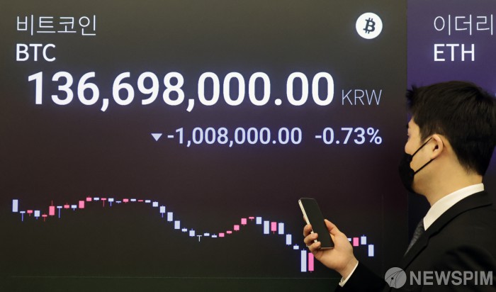 [서울=뉴스핌] 양윤모 기자 = 가상화폐 시가총액 1위 비트코인이 급락한 18일 서울 강남구 업비트 고객센터 전광판에 비트코인 거래 가격이 1억3천6백만원대로 표시되고 있다.글로벌 가상자산 플랫폼 코인마켓캡에서 비트코인은 전일(24시간 전) 대비 3.02% 하락한 9만 1953달러에 거래 중이다.비트코인 가격이 9만2000달러 선마저 붕괴하며 지난 4월 이후 최저 수준으로 추락했다. 2025.11.18 yym58@newspim.com