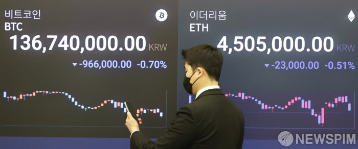 [서울=뉴스핌] 양윤모 기자 = 가상화폐 시가총액 1위 비트코인이 급락한 18일 서울 강남구 업비트 고객센터 전광판에 비트코인 거래 가격이 1억3천6백만원대로 표시되고 있다. 글로벌 가상자산 플랫폼 코인마켓캡에서 비트코인은 전일(24시간 전) 대비 3.02% 하락한 9만 1953달러에 거래 중이다. 비트코인 가격이 9만2000달러 선마저 붕괴하며 지난 4월 이후 최저 수준으로 추락했다. 2025.11.18 yym58@newspim.com