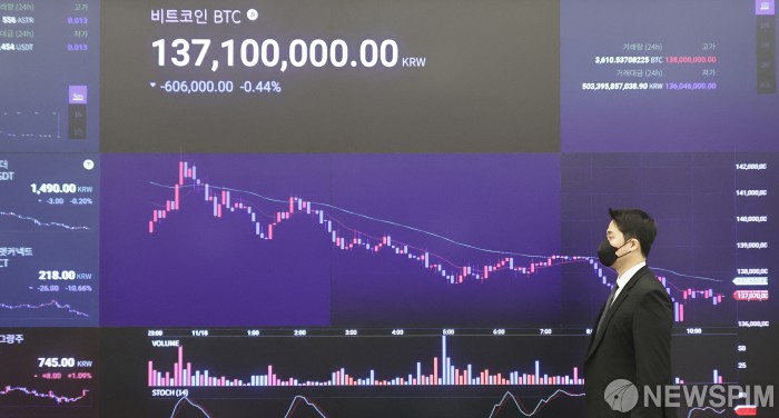 [서울=뉴스핌] 양윤모 기자 = 가상화폐 시가총액 1위 비트코인이 급락한 18일 서울 강남구 업비트 고객센터 전광판에 비트코인 거래 가격이 1억3천7백만원대로 표시되고 있다.글로벌 가상자산 플랫폼 코인마켓캡에서 비트코인은 전일(24시간 전) 대비 3.02% 하락한 9만 1953달러에 거래 중이다.비트코인 가격이 9만2000달러 선마저 붕괴하며 지난 4월 이후 최저 수준으로 추락했다. 2025.11.18 yym58@newspim.com