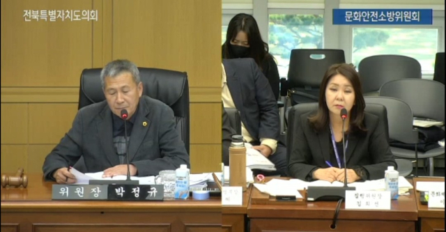 ▲박정규 전북자치도의회 문화안전소방위원장이 18일 전주세계소리축제조직위 김희선 집행위원장에게 질의를 하고 있다. ⓒ전북자치도의회 인터넷방송 |